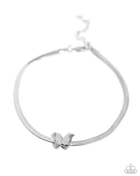 Featuring a lightly hammered texture, a dainty silver butterfly joins a sleek silver butterfly for a three-dimensional pendant that flutters atop a silver herringbone chain around the ankle for a whimsical finish. Features an adjustable clasp closure.
