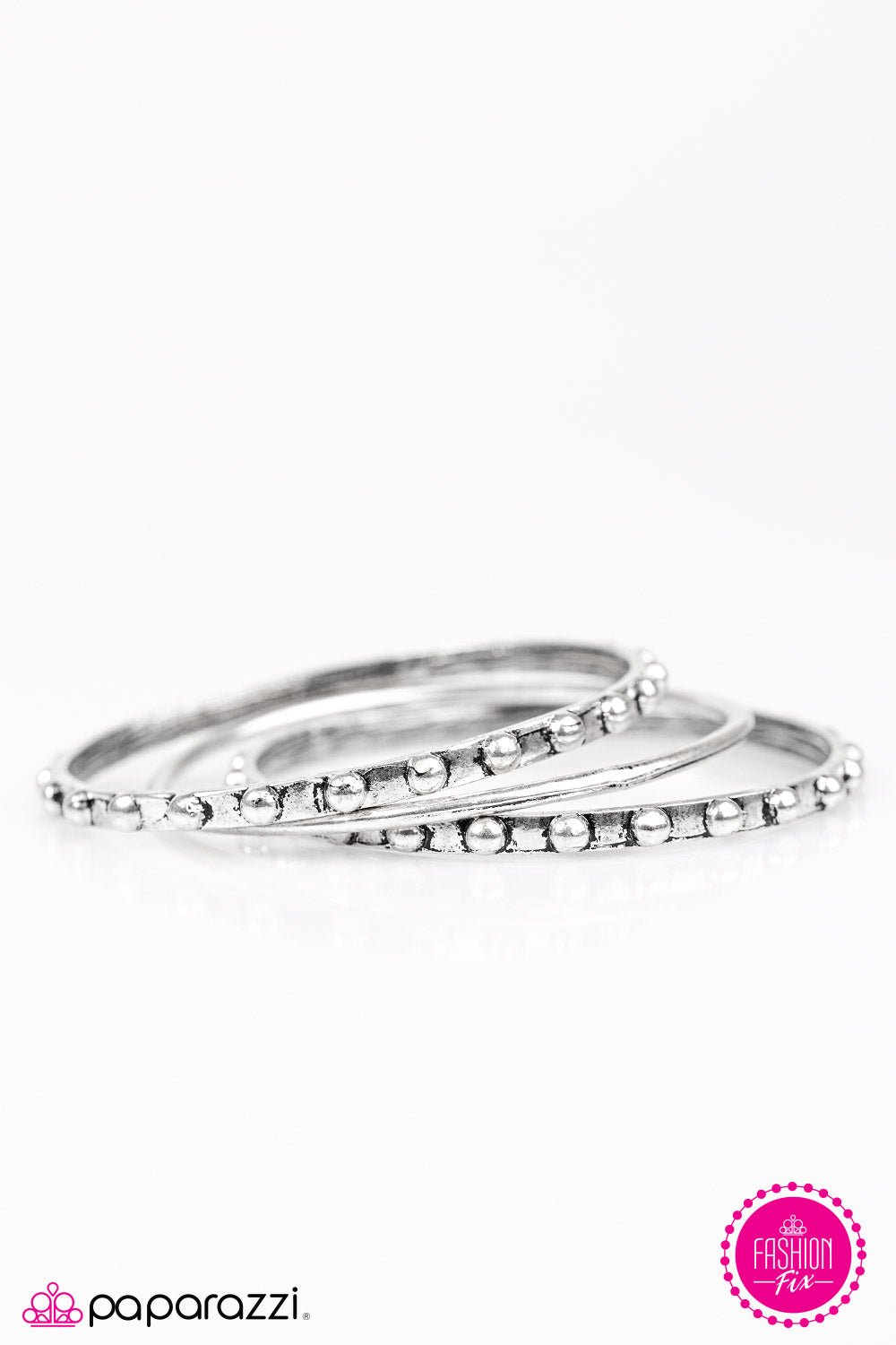 Two bangles embellished in dramatic silver studs join a skinny bangle delicately hammered with shimmer. The antiqued bangles stack across the wrist, creating a dramatic collision of metal and texture.