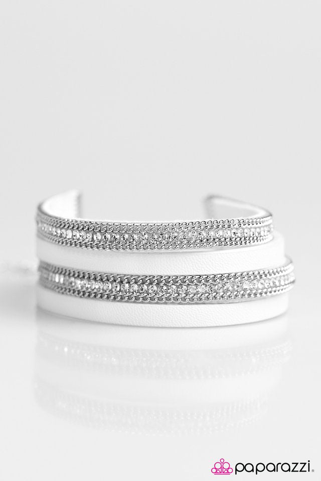 Connected to two silver accents, strands of white leather wrap around the wrist. Rows of silver chain and rhinestones alternate with the neutral white strands, adding a flashy finish to the colorfully stacked palette. Features an adjustable clasp closure.