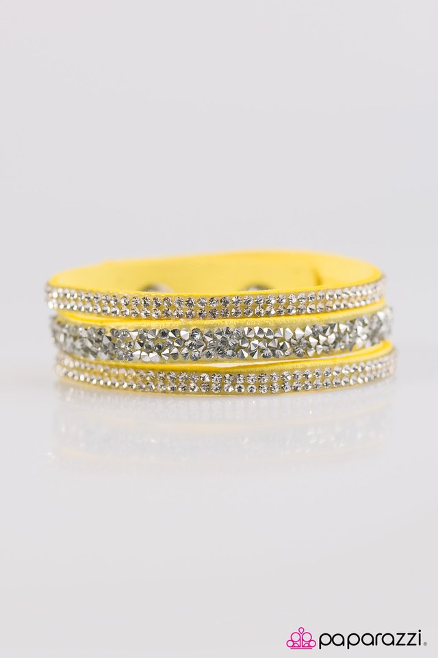 Hematite and crystal-like prisms are sprinkled along the center of a yellow suede band. Rows of dainty white rhinestones flank the sparkly center, creating an edgy stacked look around the wrist. Features an adjustable snap closure.