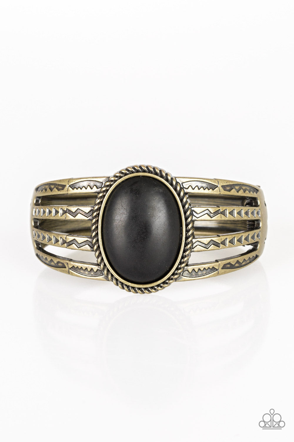 Stamped in tribal glyph-like patterns, glistening brass bars arc across the wrist, coalescing into a bold cuff-like bracelet. An earthy black stone is pressed into the center of the piece for a seasonal finish. Features a hinged closure.