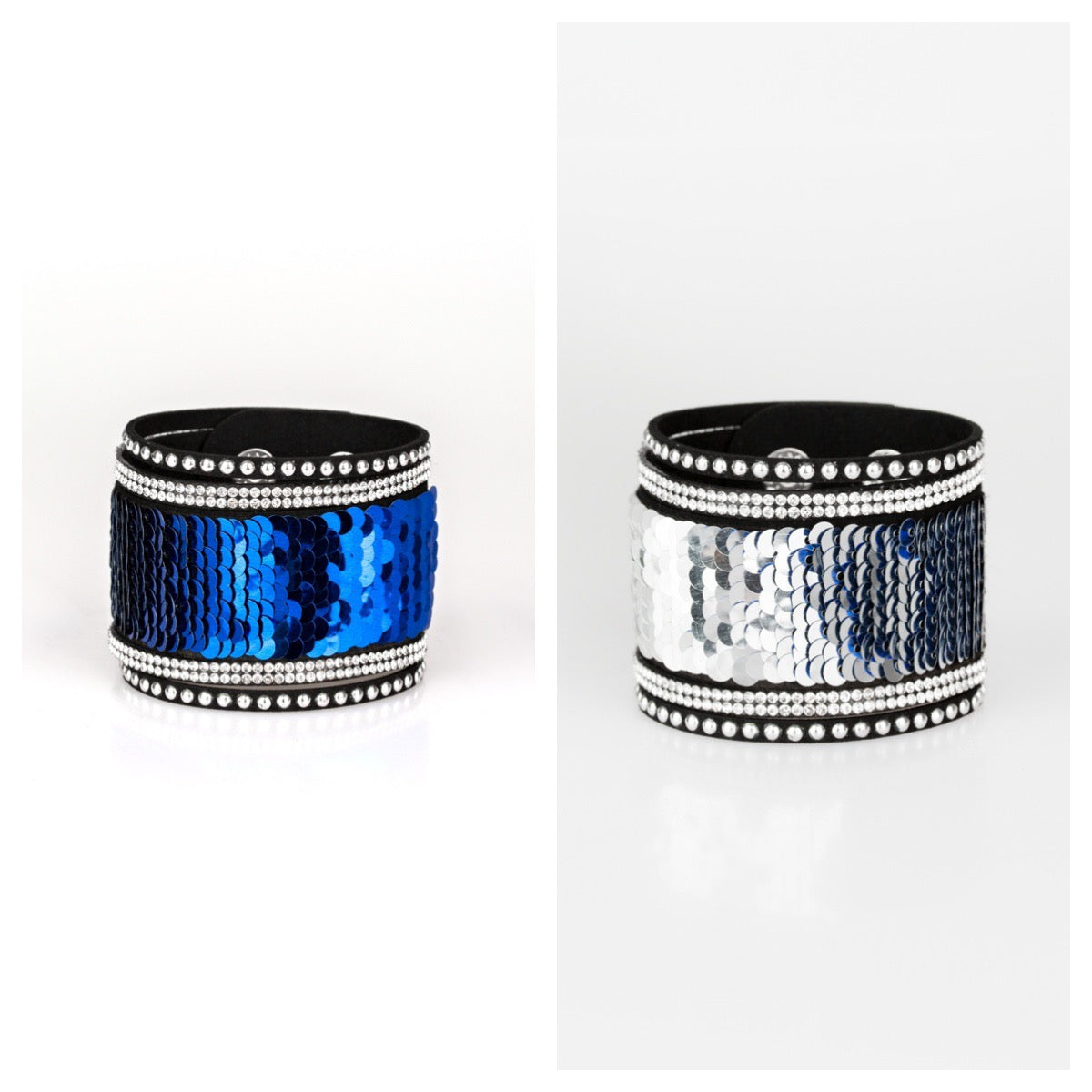 Shiny silver studs, glassy white rhinestones, and shimmering sequins are sprinkled across a thick black suede band that has been spliced into five glittery rows. Bracelet features reversible sequins that change from blue to silver. Features an adjustable snap closure.
