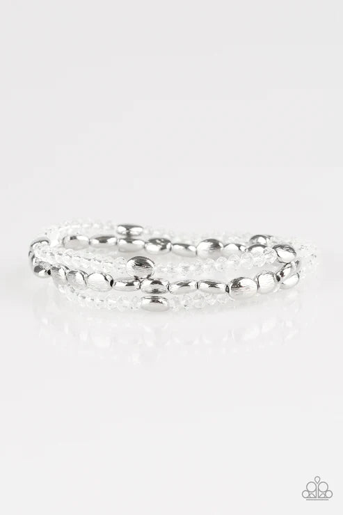 Infused with hints of silver, dainty white crystal-like beads are threaded along stretchy bands, creating whimsical layers across the wrist.