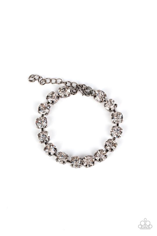 Featuring pronged gunmetal fittings, an oversized row of glassy white rhinestones connect around the wrist for a glamorous pop of glitz. Features an adjustable clasp closure.