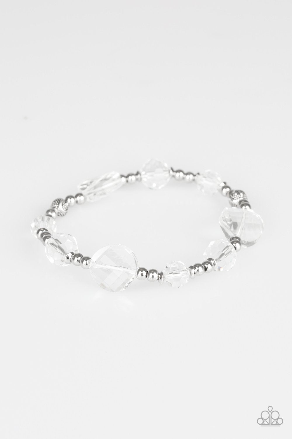 A collection of glittery white beads and shiny silver beads are threaded along a stretchy band around the wrist for a refined look. Sold as one individual bracelet.