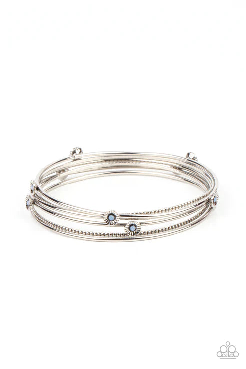 Flawless Floral Blue Bracelet features five individual bangle bracelets with two accent bangles containing blue stones. Wear these beautiful pieces to your next picnic, wedding, or day of leisure and show off your unequaled taste! Each bracelet is as breathtaking as the previous one- beautiful floral embellishments comprising her style for an enlightened future.