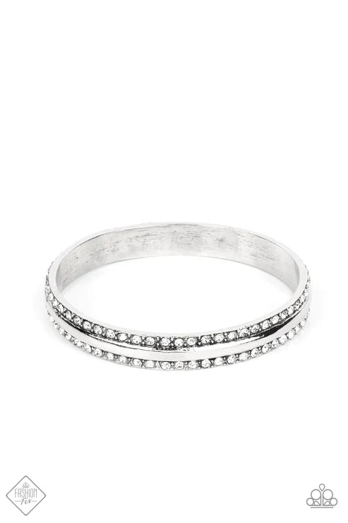 A thick band of silver forges around the wrist to create an industrial-inspired bangle. Dainty white rhinestones run along each side of the high-sheen silver, adding some understated and unexpected sparkle to the design. Sold as one individual bracelet.