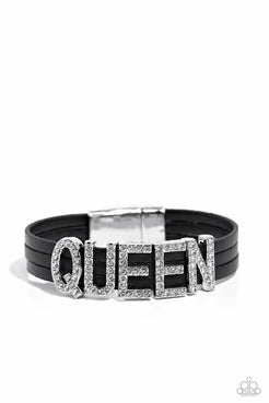 Featuring glistening white rhinestones, silver letter frames forming the word "QUEEN" are threaded along layers of black leather strands around the wrist for a dazzling statement. Features a magnetic closure.