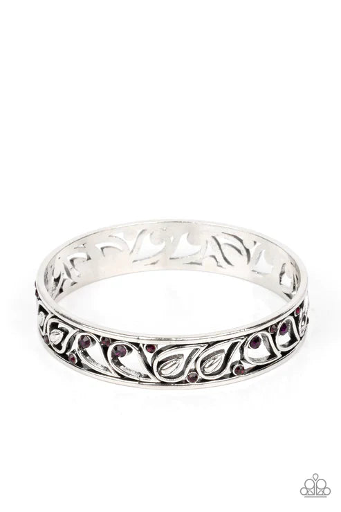 A dainty collection of glittery amethyst rhinestones are sprinkled across a collage of a paisley-inspired silver pattern that delicately coalesce into an airy bangle around the wrist, creating a shimmery seasonal centerpiece.