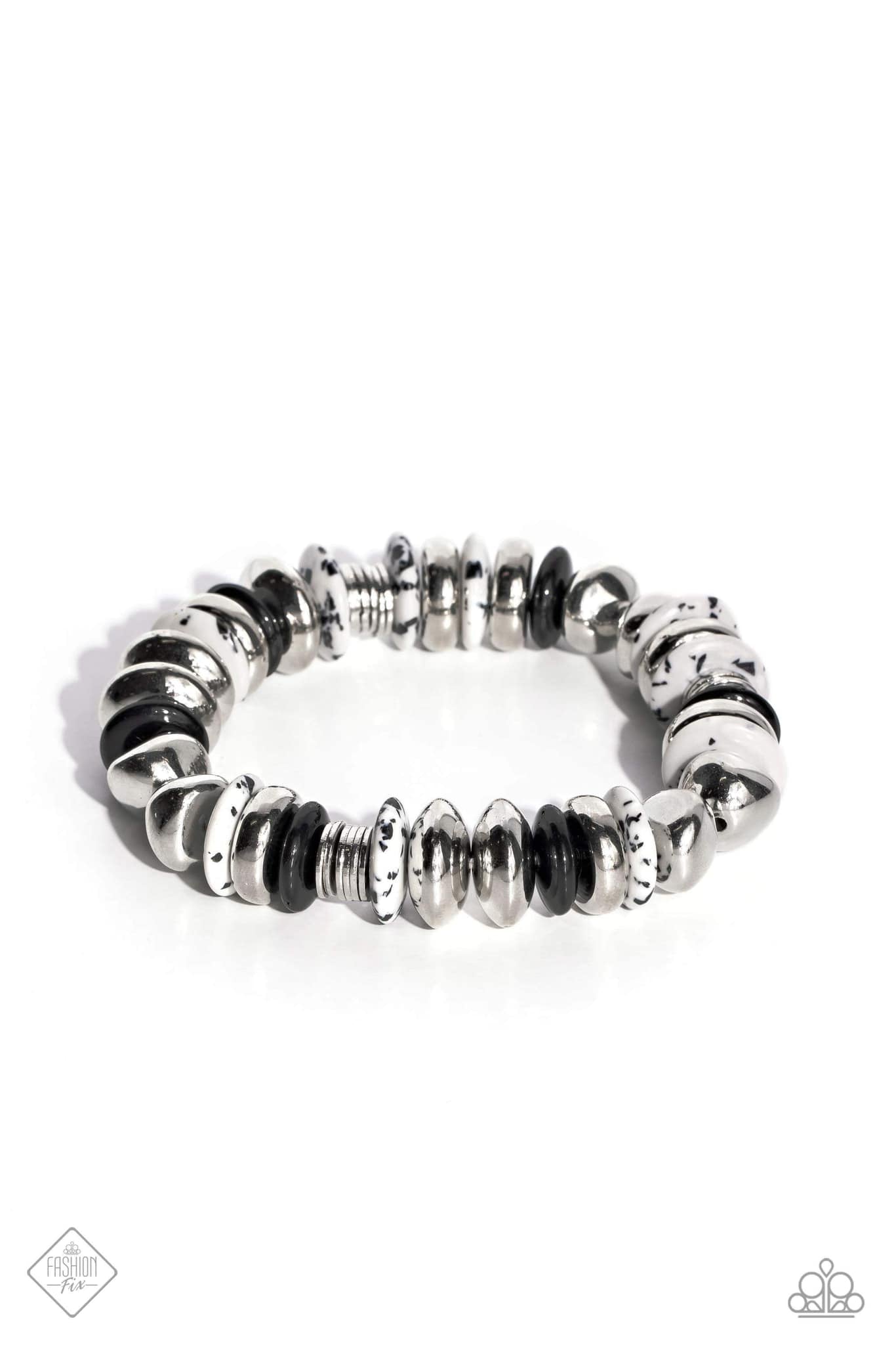 Featuring a black-dotted pattern, abstract white stone discs, black acrylic discs, and various silver discs and accents are threaded along an elastic stretchy band for a high-end, artisanal-inspired look. As the stone elements in this piece are natural, some color variation is normal. Sold as one individual bracelet.