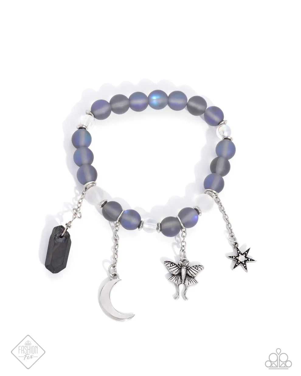 Infused along an elastic stretchy band, a collection of clear and blue-brushed hematite beads, and silver discs combine for a pop of color around the wrist. Various earthy and stellar charms drip below the display on differing lengths of silver chain including a highly-detailed silver moth, a chiseled hematite stone, a silver crescent moon, and an opalescent-centered silver star for a majestic finish.