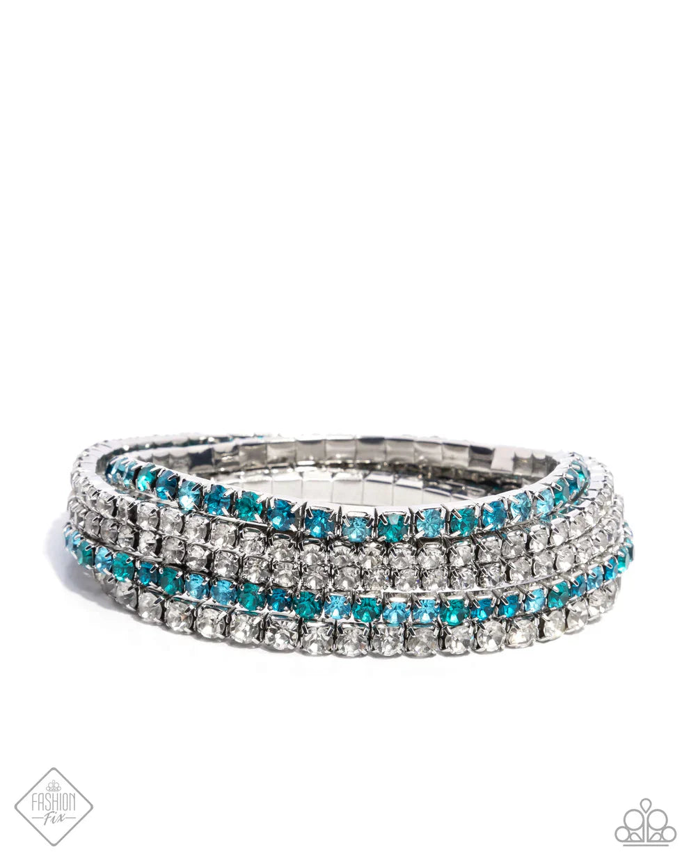 Set in silver square fittings, a collection of white, aquamarine, and blue zircon gems stack up the wrist in varying sizes for a feminine display of shimmer and color.