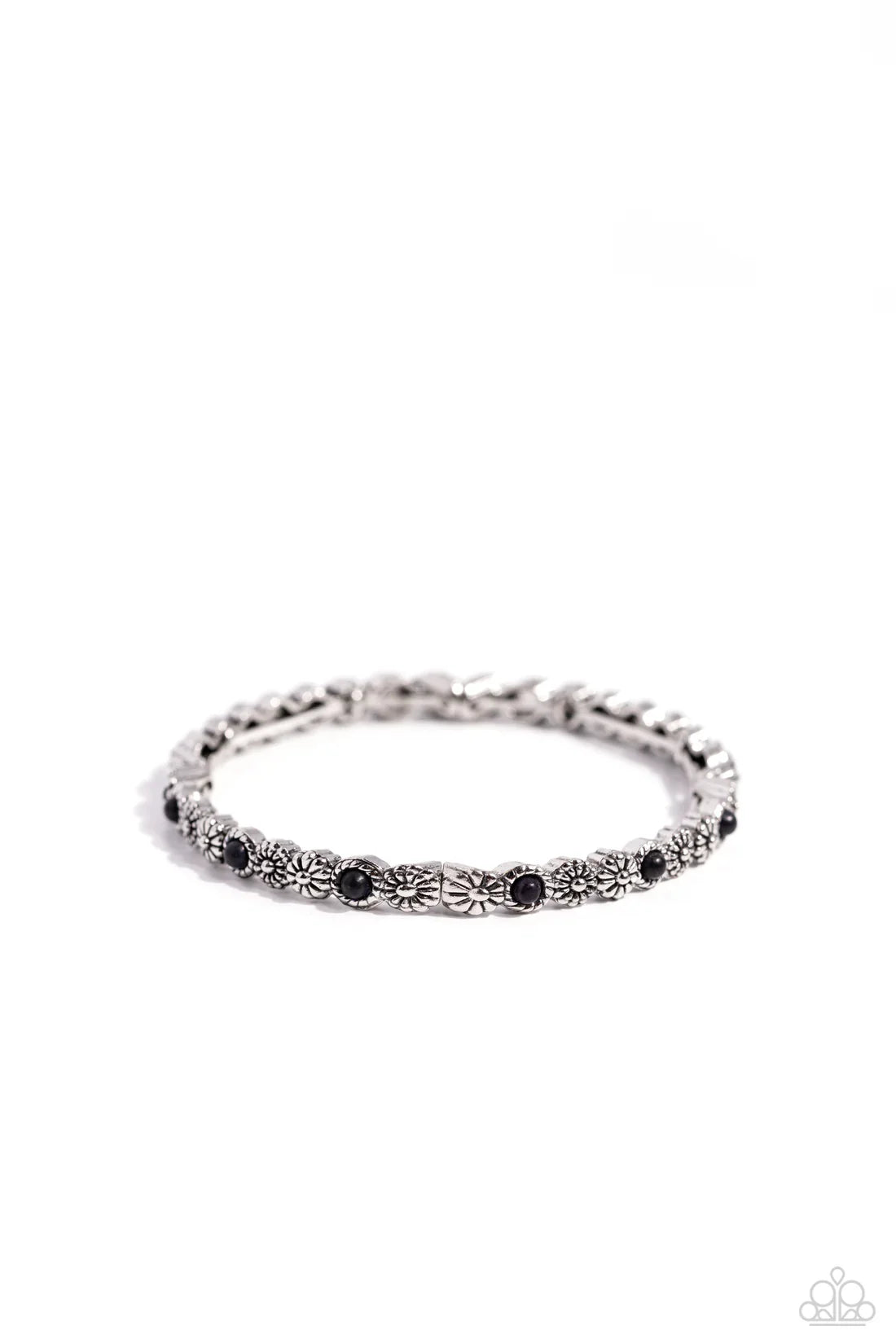 A dainty collection of ornate silver flowers alternate with black-centered silver flowers along the wrist on stretchy bands for a whimsical pop of fashion.