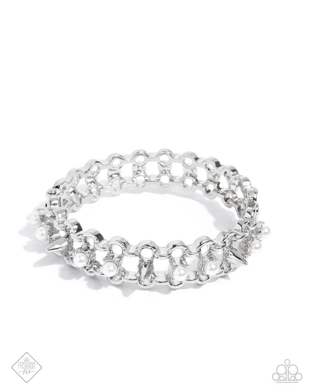 Fusing two silver cable chains along the wrist, a flared row of silver spikes alternate between duos of white pearls along the center of the design, creating an abstract blend of punk and polish. Features a hinged closure.