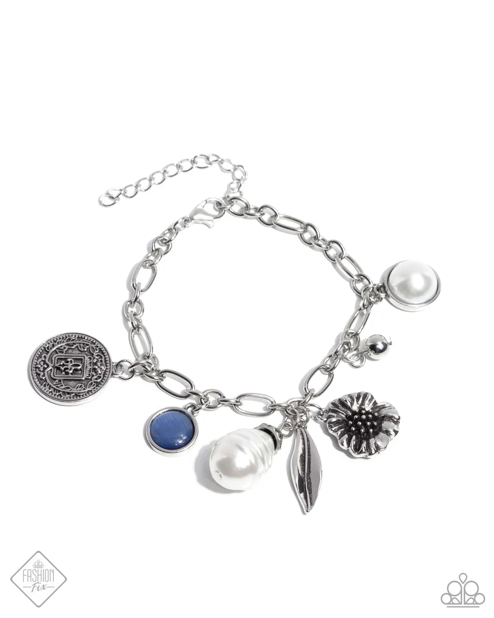 Infused along a silver paperclip and round alternating chain, a collection of vintage charms, including a baroque white pearl, a silver fleur-de-lis-embellished pendant, a blue cat's eye stone in a silver circular fitting, a silver feather, a solitaire silver bead, a silver-studded flower, and a white pearl pressed in a circular frame create a dynamic display of interest along the wrist. Features an adjustable clasp closure.