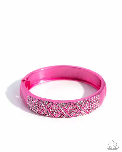 Featuring a vibrant metallic pink hue, glistening white rhinestones coalesce across the surface of a sleek cuff in rows, diamond-cut shapes, and x's for an attention-grabbing pop of shimmer. Features a hinged closure.