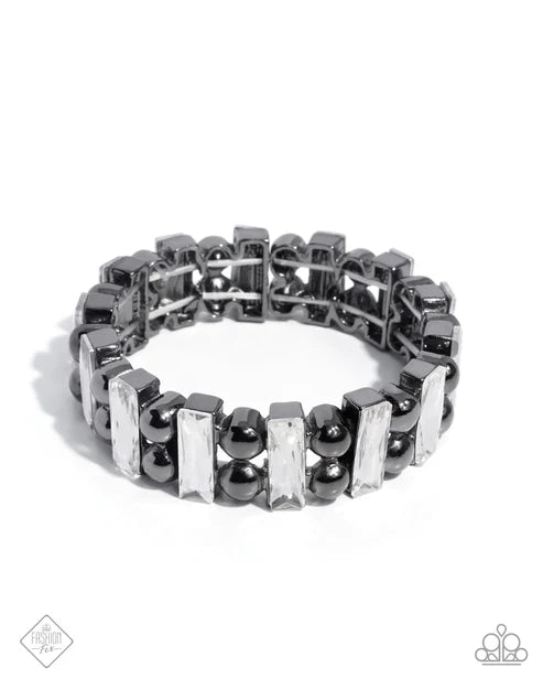 Infused along an elastic stretchy band, a collection of emerald-cut white gems in gunmetal fittings alternate beside stacked gunmetal beads for a dazzling determined display. Sold as one individual bracelet.
