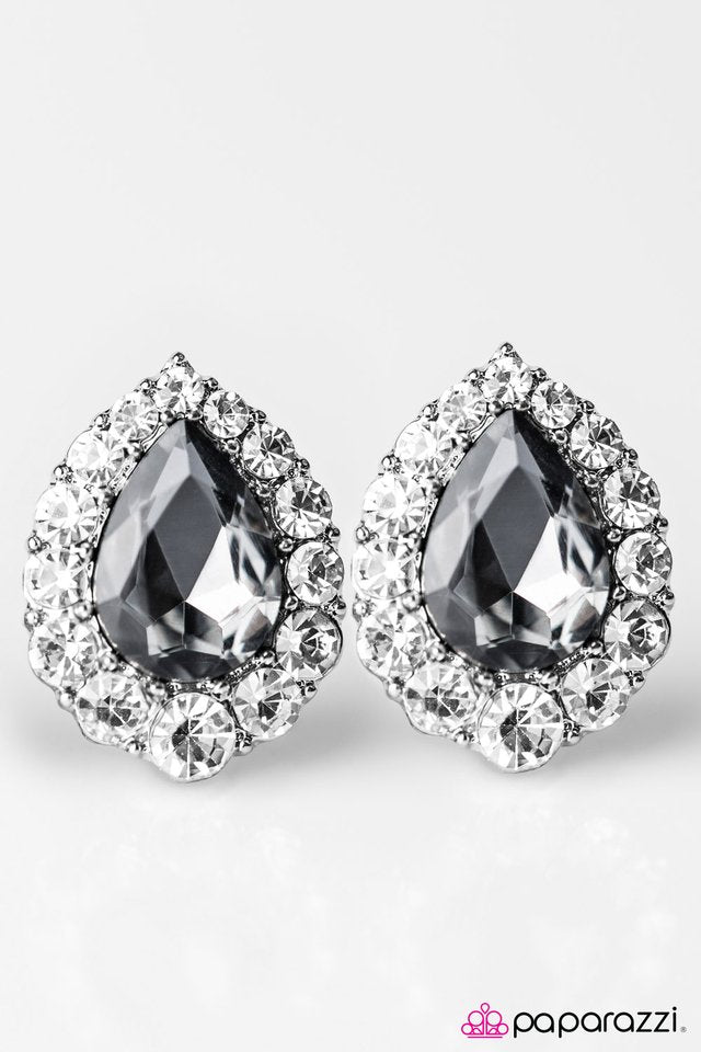 White rhinestones encircle a glittery teardrop, creating a regal design. Earring attaches to a standard post fitting.