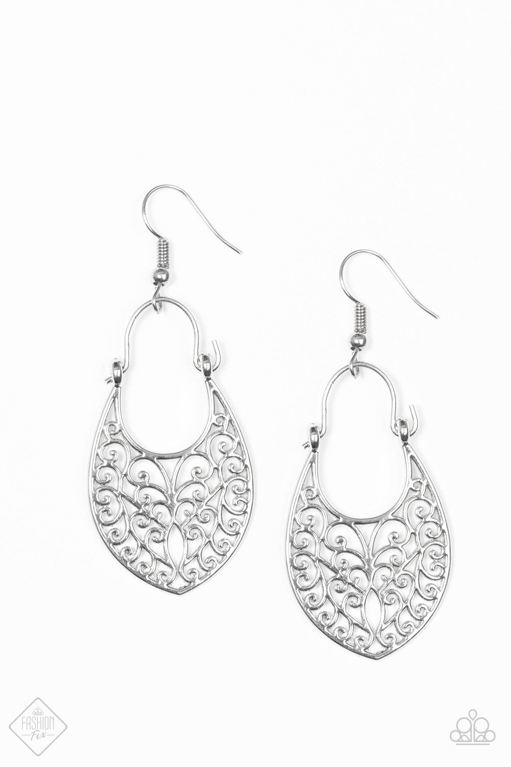 Brushed in a shiny silver finish, glistening filigree climbs a spade-shaped frame, creating a regal lure. Earring attaches to a standard fishhook fitting.