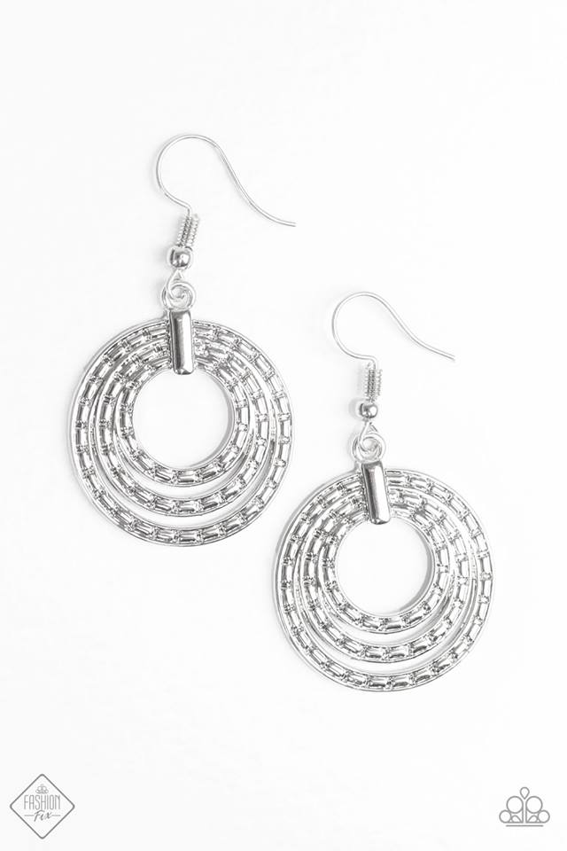 Pinched between a shiny silver fitting, shimmery textured hoops layer into a dizzying lure. Earring attaches to a standard fishhook fitting.