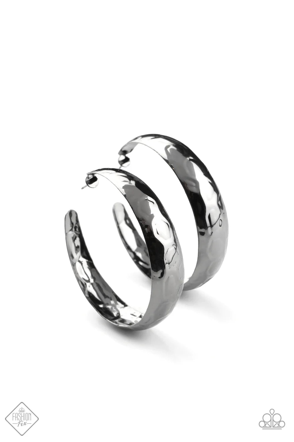 Featuring edgy diamond-cut texture, a glistening gunmetal hoop curls around the ear in a bold industrial fashion. Earring attaches to a standard post fitting. Hoop measures 2 1/4” in diameter.