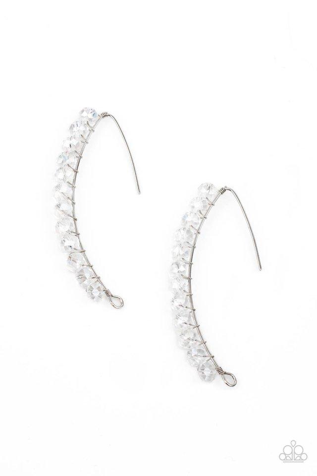 A glittery collection of iridescent white rhinestones are fitted in place along a curved silver wire, creating a glamorous hanging post. Earring attaches to a standard hanging post fitting. Elegant shimmering rhinestones collaborating together and curving down your ear will add shimmer to your date night.