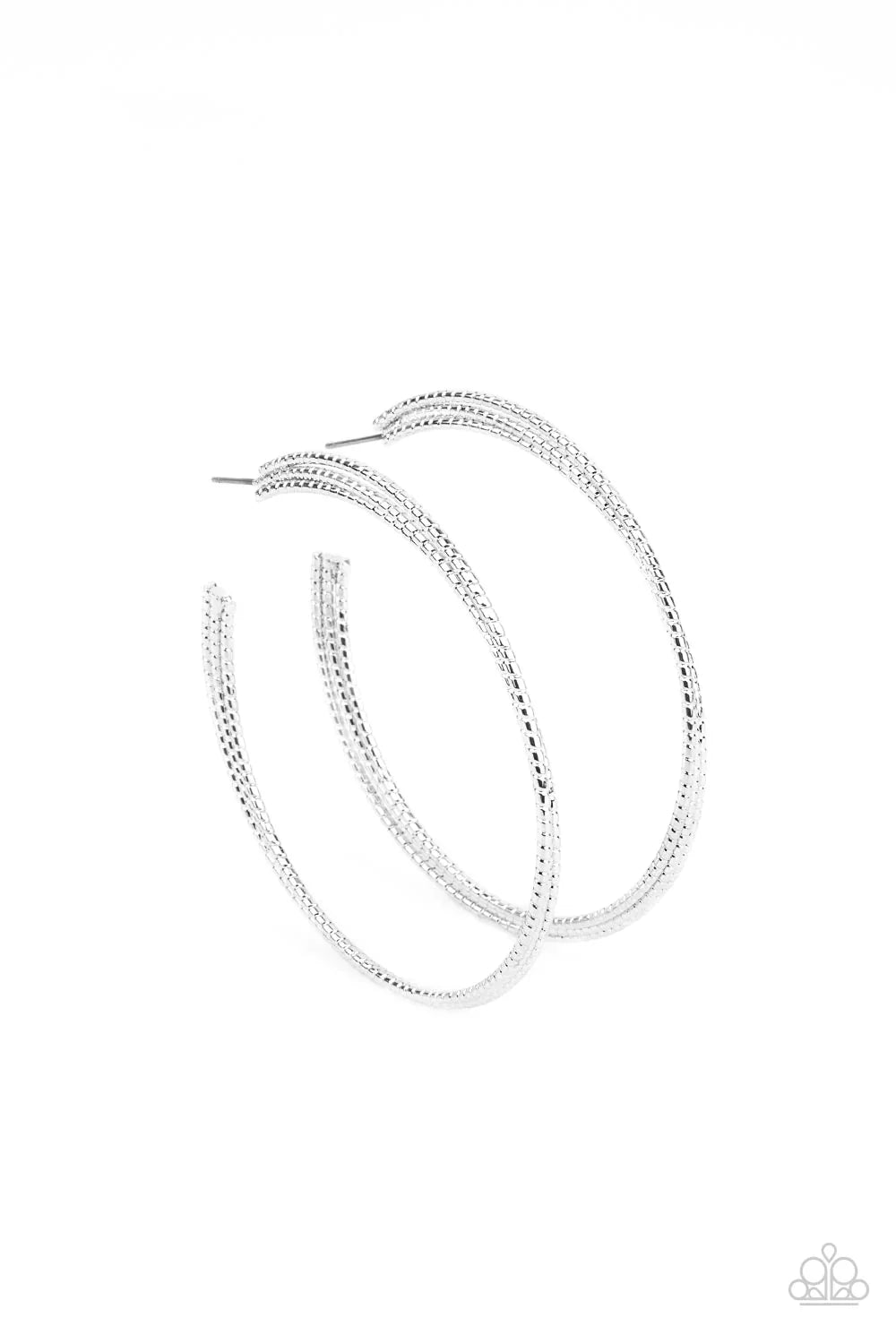Cut in tactile texture, three silver bars delicately stack and curve into a layered hoop for an edgy urban look. Earring attaches to a standard post fitting. Hoop measures approximately 2 1/2" in diameter.