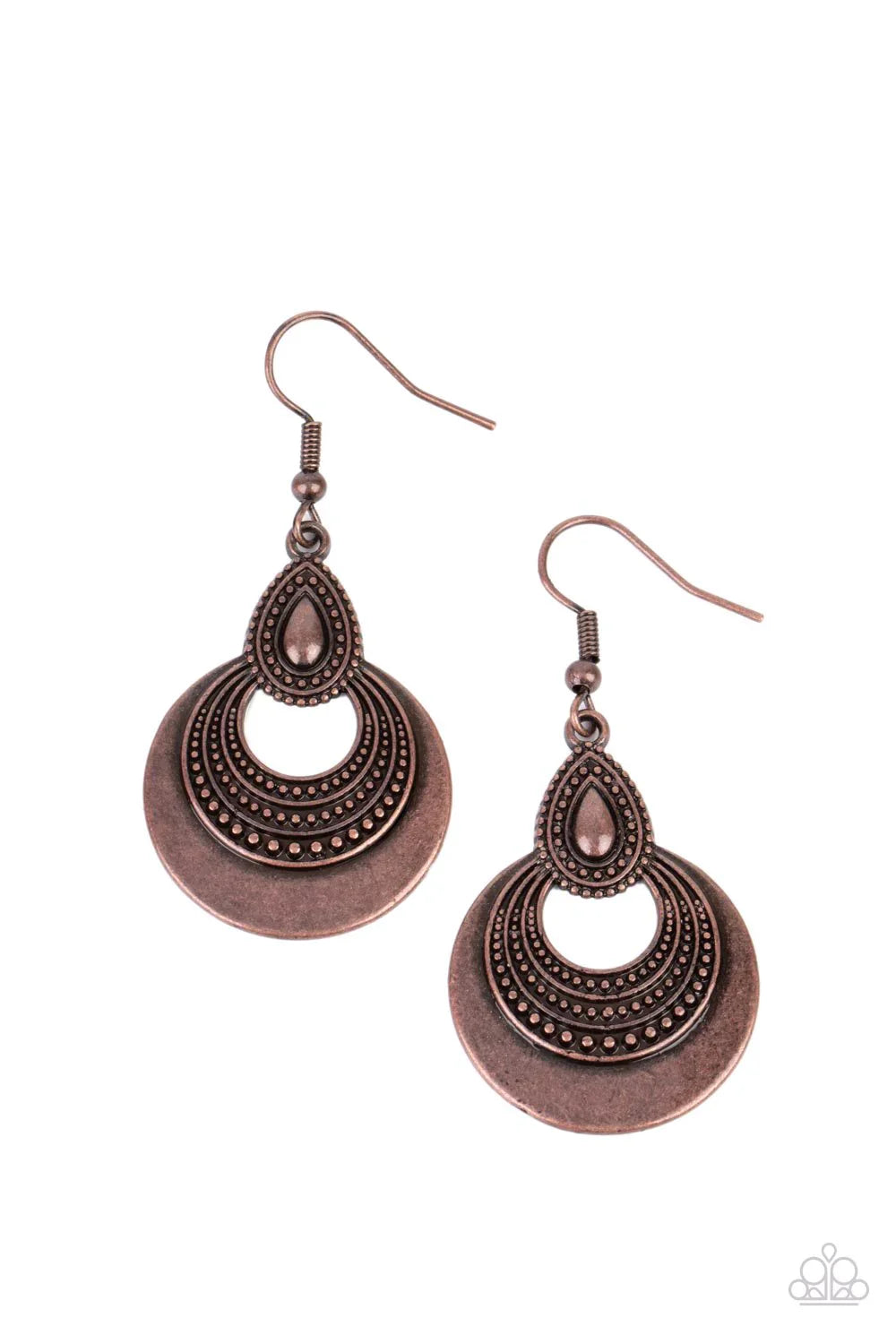 A studded copper teardrop adorns the top of a studded copper crescent shaped frame, creating a rustic inspired lure. Earring attaches to a standard fishhook fitting. Sold as one pair of earrings.