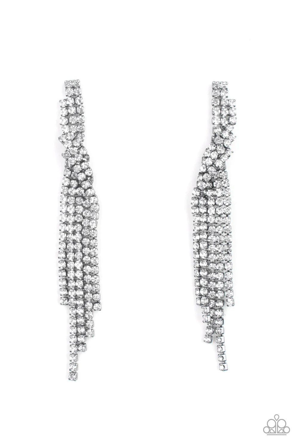 Encased in glistening gunmetal fittings, dainty strands of glittery white rhinestones delicately overlap into a tapered tassel for a twinkly look. Earring attaches to a standard post fitting.