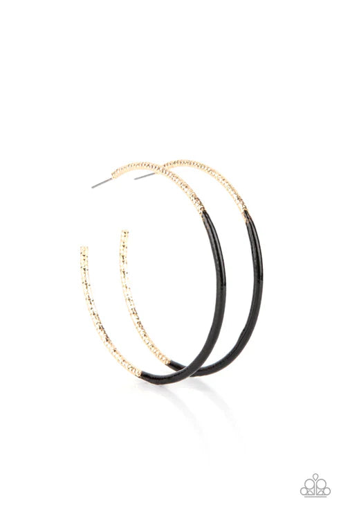 Featuring faceted diamond cut texture, a shimmery gold hoop is dipped in black paint for a colorful flair. Earring attaches to a standard post fitting. Hoop measures approximately 2 3/4" in diameter.