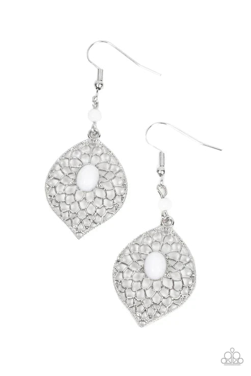Airy silver petals bloom from an oval white beaded center at the bottom of a solitaire white bead, resulting in a whimsical floral lure. Earring attaches to a standard fishhook fitting. Sold as one pair of earrings.
