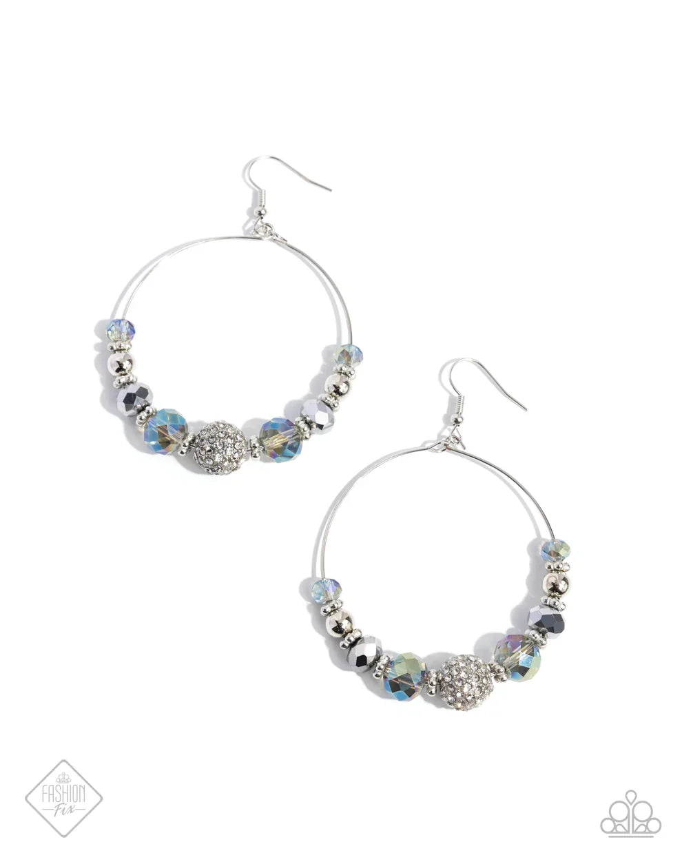 Silver, faceted silver, UV-splashed, opalescent beads, and white rhinestone-encrusted silver ornaments are threaded along a dainty silver wire, creating a colorful, iconic hoop. Earring attaches to a standard fishhook fitting. Due to its prismatic palette, color may vary.