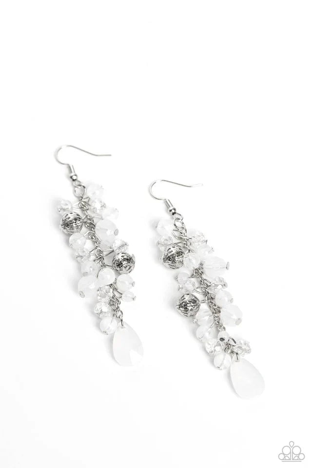 Adorn your ears with an enchanting chandelier of delicate elegance. This captivating collection features cascading white teardrop and round beads, accented by textured silver embellishments and sparkling faceted crystal-like beads. Each piece dangles gracefully from a single silver chain, culminating in a charmingly clustered design. Effortlessly secure them with a standard fishhook fitting for a timeless accessory.