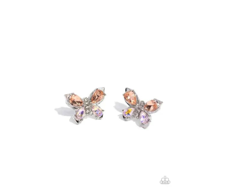 Featuring peach and UV-shimmery teardrop gems, a glistening silver butterfly sparkles at the ear for an enchanting fashion. Earring attaches to a standard post fitting. Sold as one pair of post earrings.