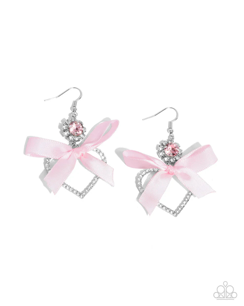 Pressed in a silver-pronged, white rhinestone-embellished sunburst frame, a light rose gem gives way to a white rhinestone-embellished heart frame for a regally romantic look. A baby pink satin ribbon is tied in between the two glittery frames for additional refinement. Earring attaches to a standard fishhook fitting.