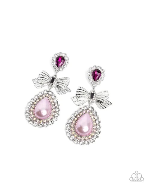 Pressed in a white rhinestone border, an upside-down fuchsia teardrop gives way to a textured, white rhinestone-dusted silver bow with an emerald-cut black center, finally giving way to a teardrop baby pink pearl bordered in white rhinestones and dainty iridescent rhinestones for a ladylike luminescent lure. Earring attaches to a standard post fitting. Due to its prismatic palette, color may vary. Sold as one pair of post earrings.