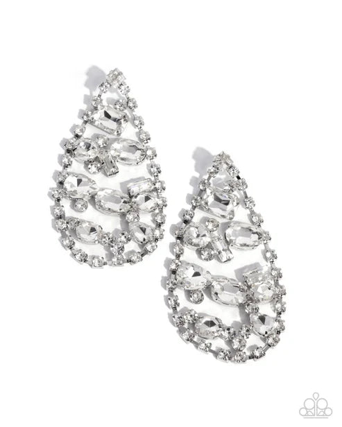 Sparkling white rhinestones are arranged in intricate patterns along teardrop-shaped silver frames, creating a dazzling chandelier-like design. The teardrop, round, oval, and emerald cuts add to the sparkling theme. Earring attaches to a standard post fitting. Sold as one pair of post earrings.
