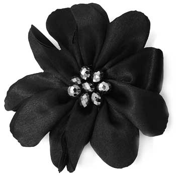Black satin petals gather around a glittery beaded center. Brushed in a shimmery finish, the faceted beads catch and reflect the light for a sparkling finish. Features a standard hair clip and pin on the back for endless accessorizing fun!