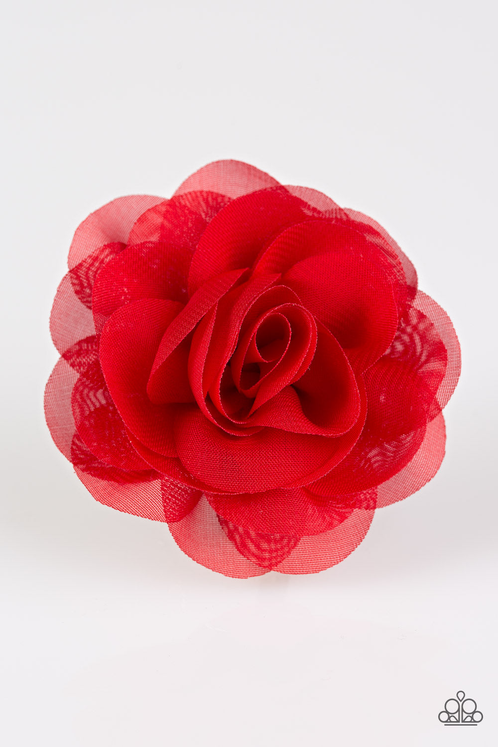 Airy red chiffon gathers into a feminine blossom for a seasonal look. Features a standard hair clip on the back.