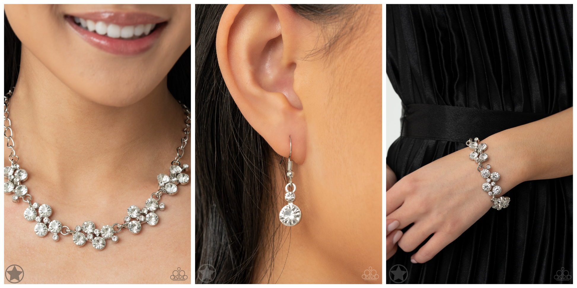 A row of dazzling white rhinestones drapes along the neckline, creating a sparkling display. Daintier white rhinestones are sprinkled along the clusters, adding luminous detail to the timeless design. Features an adjustable clasp closure. Includes one pair of matching earrings.