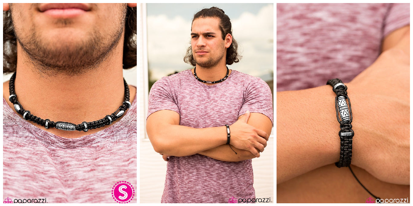 Shiny black cording braids around the neck in an urban fashion. Black cording knots around silver accents and an ornate silver bead for a tactile finish.