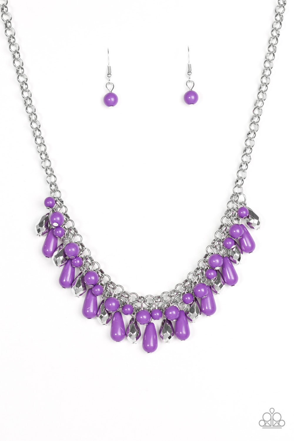 Featuring round and teardrop styles, vivacious purple and faceted silver beads swing from the bottoms of interlocking silver chains, creating a bold fringe below the collar. Features an adjustable clasp closure.