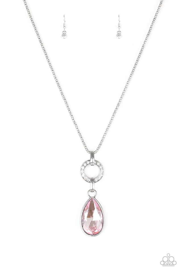 Encrusted in glittery white rhinestones, a shimmery silver ring gives way to a dramatic pink gem teardrop. The impressive pendant slides along a shimmery silver popcorn chain for a refined look. Features an adjustable clasp closure.