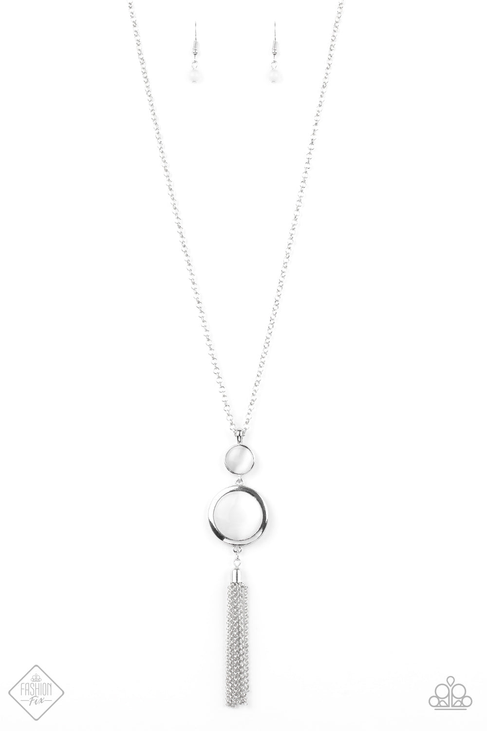 Swinging from the bottom of a glistening silver chain, a pair of glowing stacked moonstone pendants give way to a shimmery silver tassel for a refined look. Features an adjustable clasp closure.