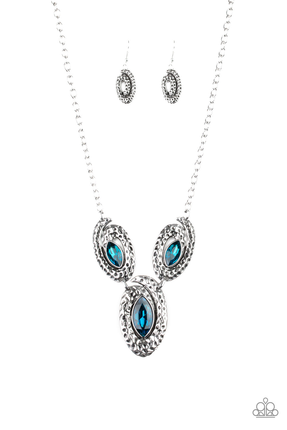 A trio of glittery blue marquise-cut rhinestones are nestled inside swirls of hammered silver frames, creating a dazzling statement piece below the collar. Features an adjustable clasp closure.
