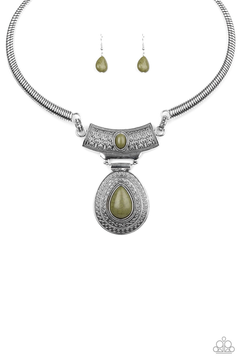 Etched in linear textures, bowing silver bars link with an ornate silver plate dotted with an earthy green stone. Embossed in dizzying tribal inspired patterns, an oversized green stone dotted teardrop pendant swings from the bottom of a courageous finish. Features an adjustable clasp closure.
