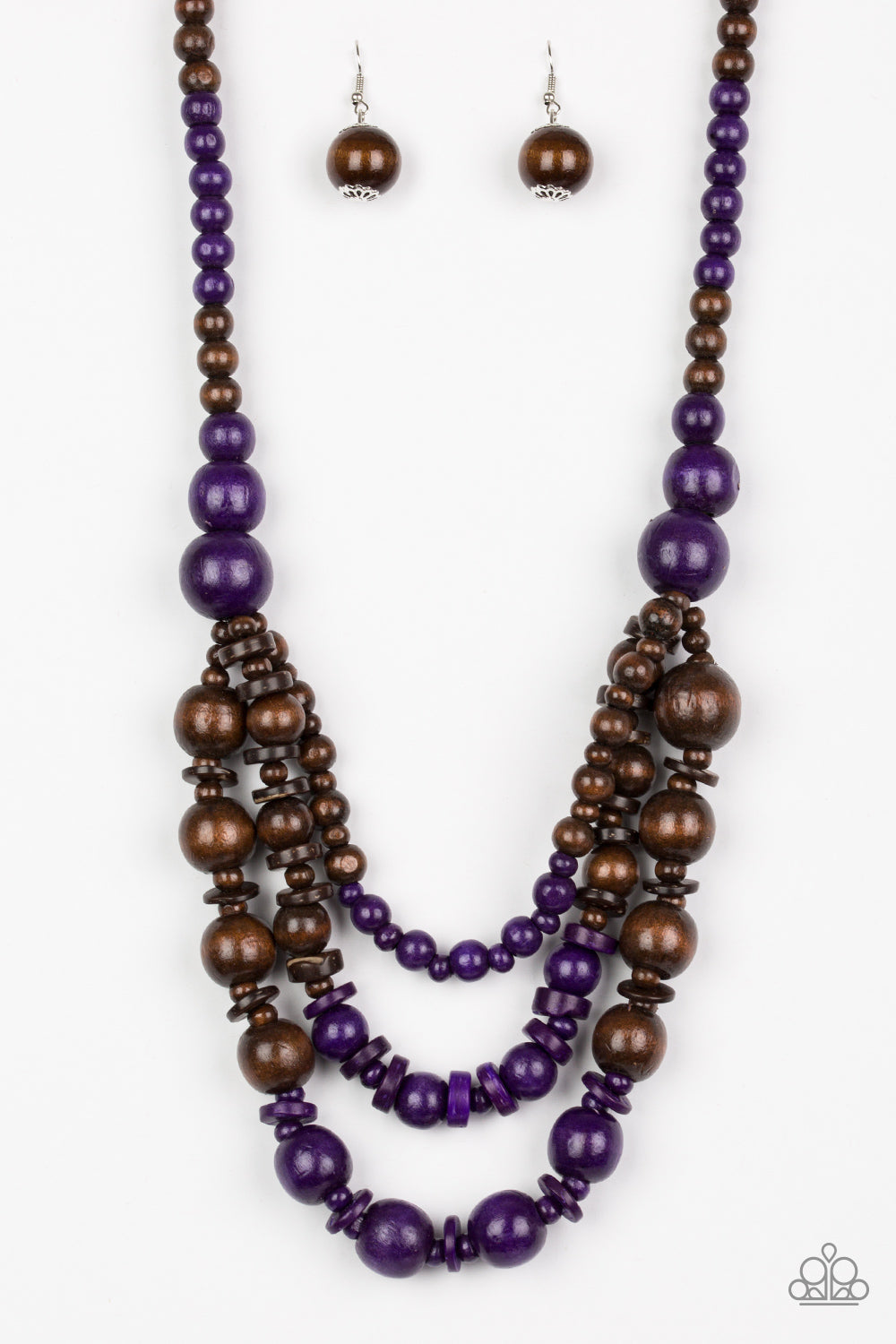 Brushed in playful purple and earthy brown finishes, vivacious wooden beads and discs are threaded along strands of shiny brown cording for a summery look.