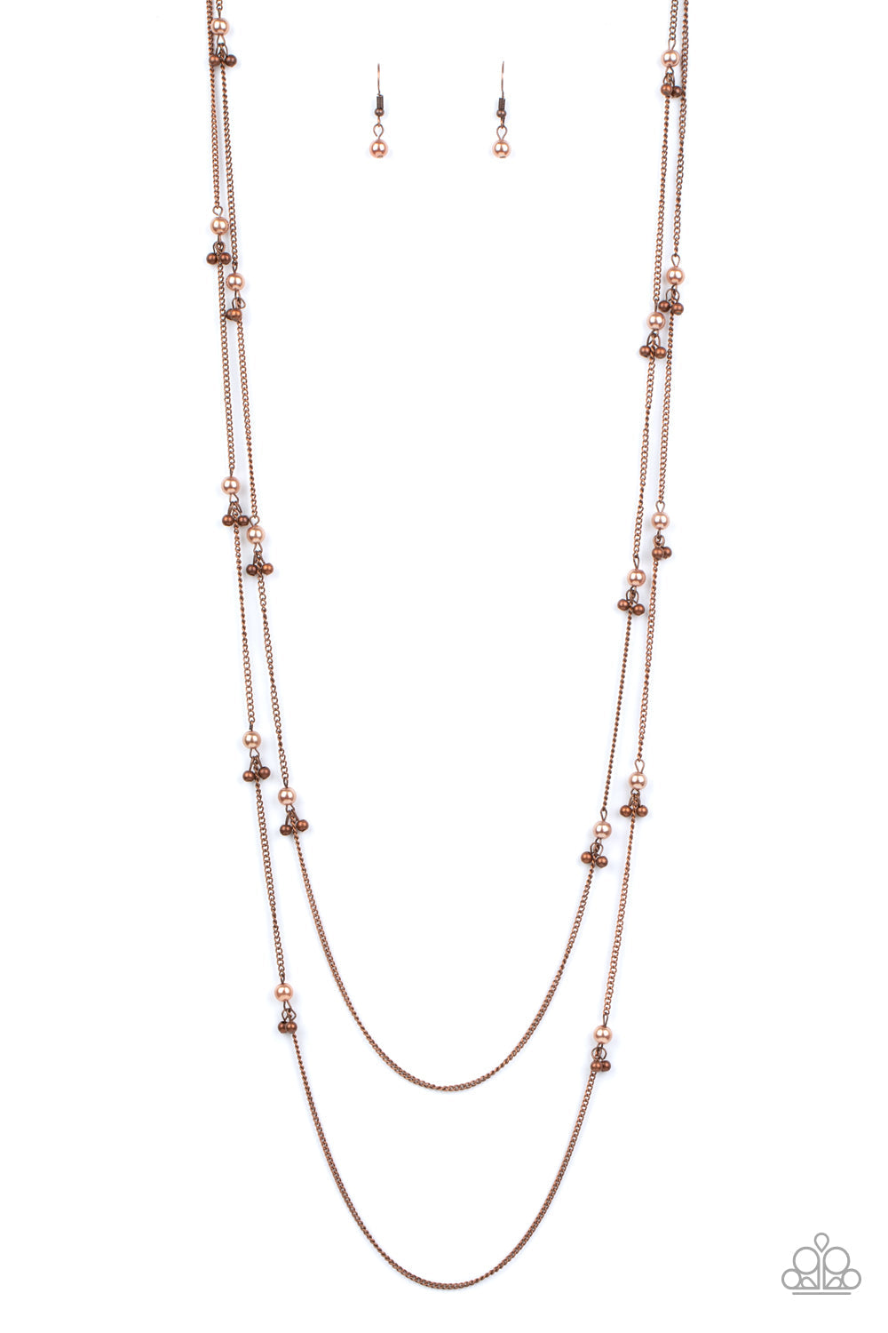 Infused with pearly accents, pairs of copper beads trickle along dainty copper chains for a glamorous look. Features an adjustable clasp closure.