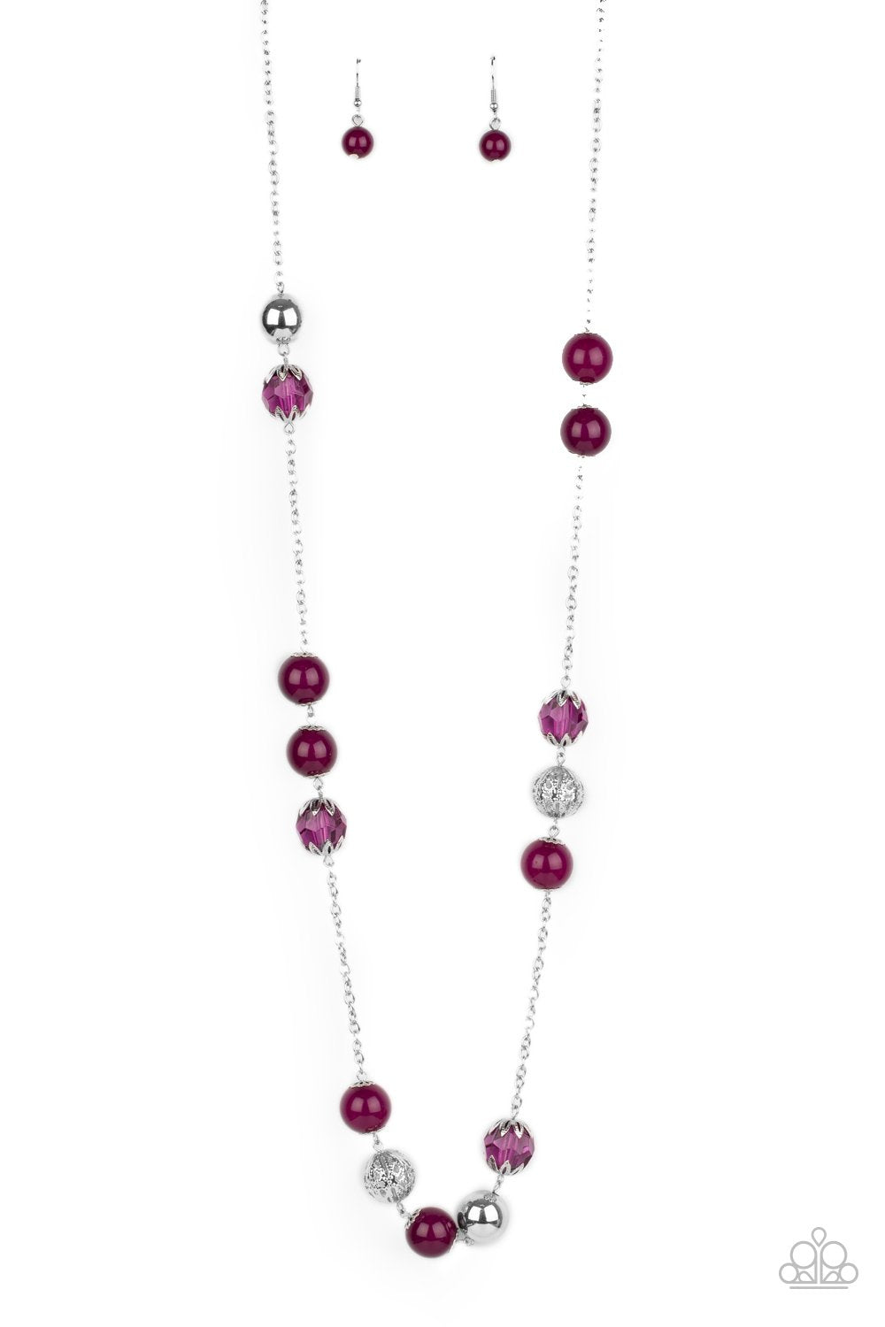Infused with shiny silver beads and silver ornaments, a collection of glassy, polished, and crystal-like Magenta Purple beads drape across the chest for a colorful collision. Features an adjustable clasp closure.