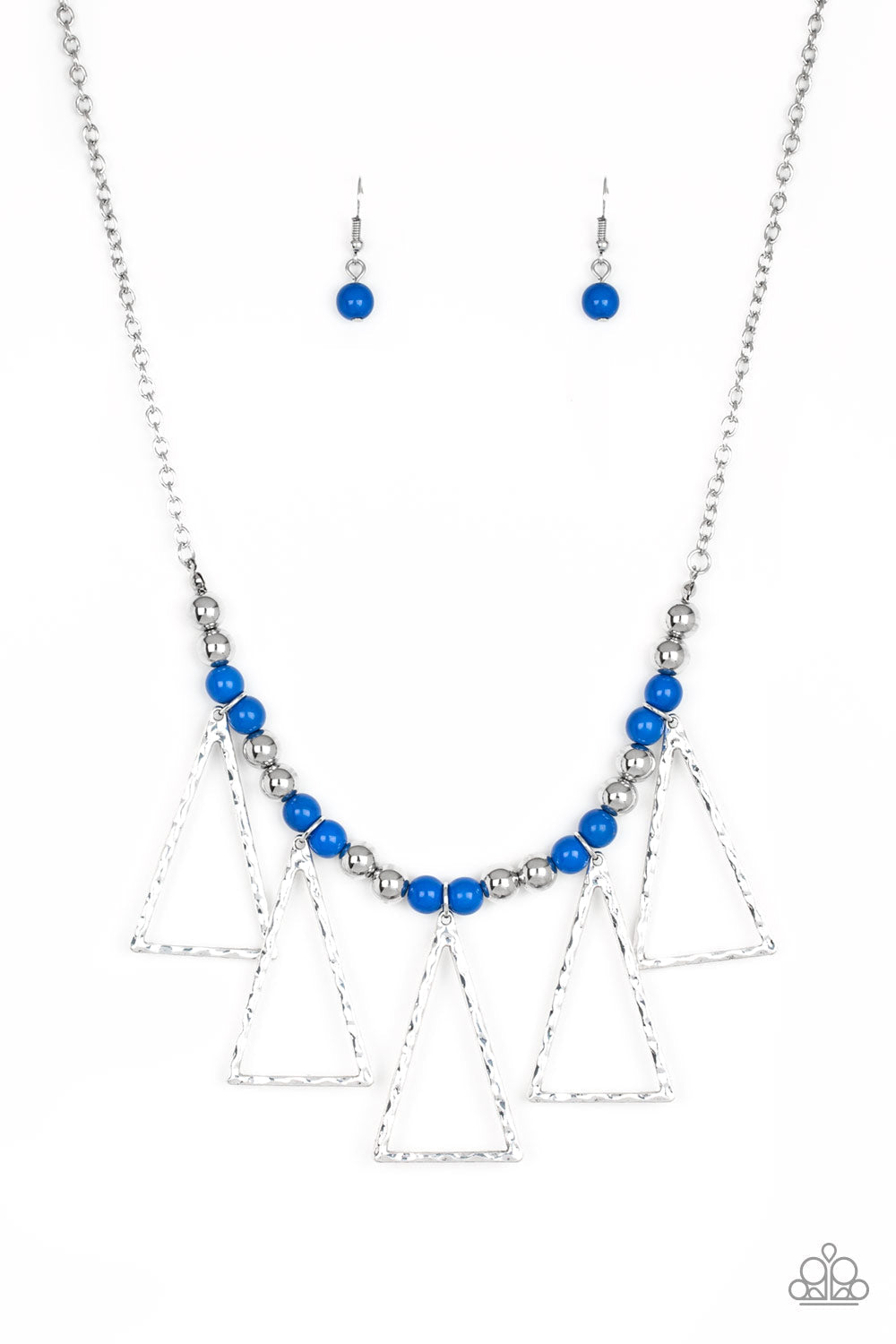 A collection of shiny silver and refreshing blue beads are threaded along an invisible wire below the collar. Hammered triangular frames swing from the bottom of the colorful compilation, creating an artistic fringe. Features an adjustable clasp closure.